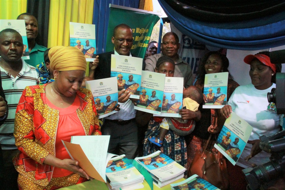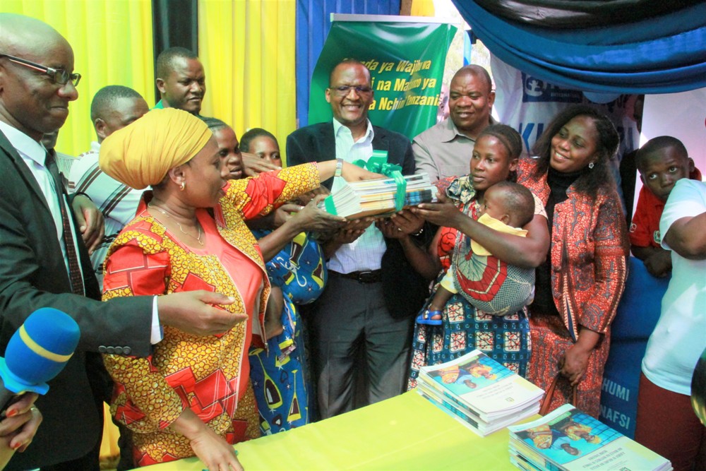 Waziri wa Afya, Maendeleo ya Jamii, Jinsia, Wazee na Watoto Ummy Mwalimu Akizindua kitini cha Ajenda ya wajibu wa wazazi wa Malezi na matunzo ya familia Nchini Tanzania wakati wa kilele cha Maadhimisho ya Siku ya Mtoto wa Afrika yaliyoitimishwa leo katika viwanja vya Shule ya Msingi Mkapa iliyo katika mji mdogo wa Katoro Mkoani Geita.