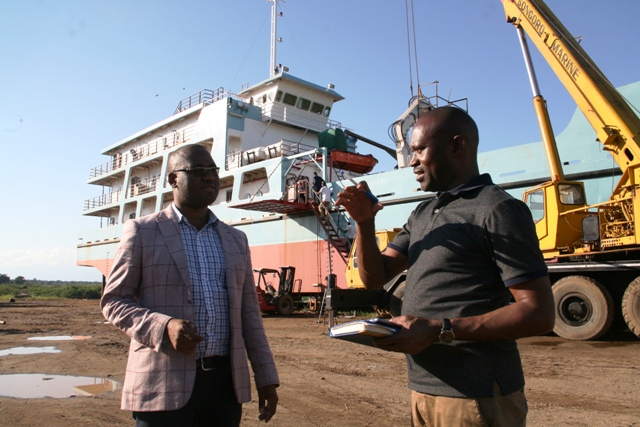 Meneja wa Bandari (TPA) Kanda ya ziwa Nyasa Bw. Abeid Galus akizungumza na Afisa Mawasiliano Mwandamizi wa Mamlaka ya Bandari TPA Bw. Leonard Magomba wakati waandishi wa habari walipotembelea na kujionea ujenzi wa meli ya MV Mbeya II katika bandari ya Itungi Kyela mkoani Mbeya.