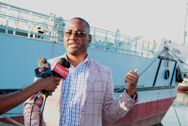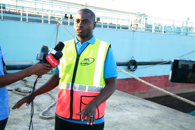 Meneja wa Bandari (TPA) Kanda ya ziwa Nyasa Bw. Abeid Galus akifafanua jambo kwa waandishi wa habari huku akionyesha meli ya MV Ruvuma.