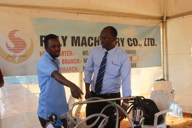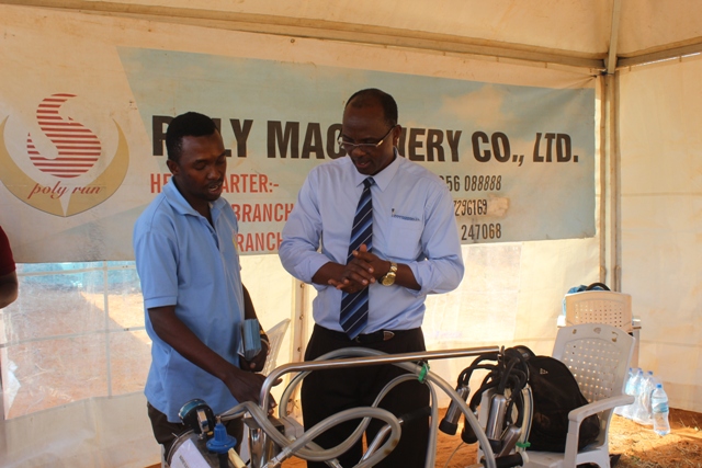 Katibu wa Wizara ya Mifugo na Uvuvi,Prof.Elisante Ole Gabriel,akimsikiliza Meneja wa Tawi la Dodoma Bw.Dickson Raymond toka Kampuni ya Poly Machinery Co.Ltd akiwa anakagua maandalizi ya kesho kufunga maonesho ya gwaride la ng’ombe bora nchini ambapo mgeni rasmi atakuwa Naibu Waziri wa Mifugo na Uvuvi,Mhe.Abdalah Ulega