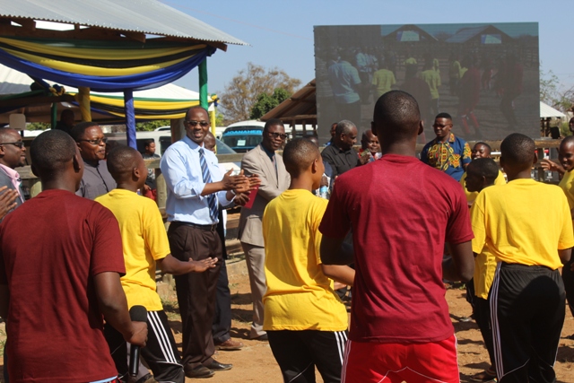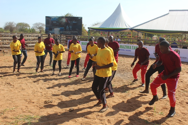 Katibu wa Wizara ya Mifugo na Uvuvi,Prof.Elisante Ole Gabriel,akicheza na vijana ambao walikuwa wakitoa burudani alipokuwa ameenda kukagua maandalizi ya kesho kufunga maonesho ya gwaride la ng’ombe bora nchini ambapo mgeni rasmi atakuwa Naibu Waziri wa Mifugo na Uvuvi,Mhe.Abdalah Ulega