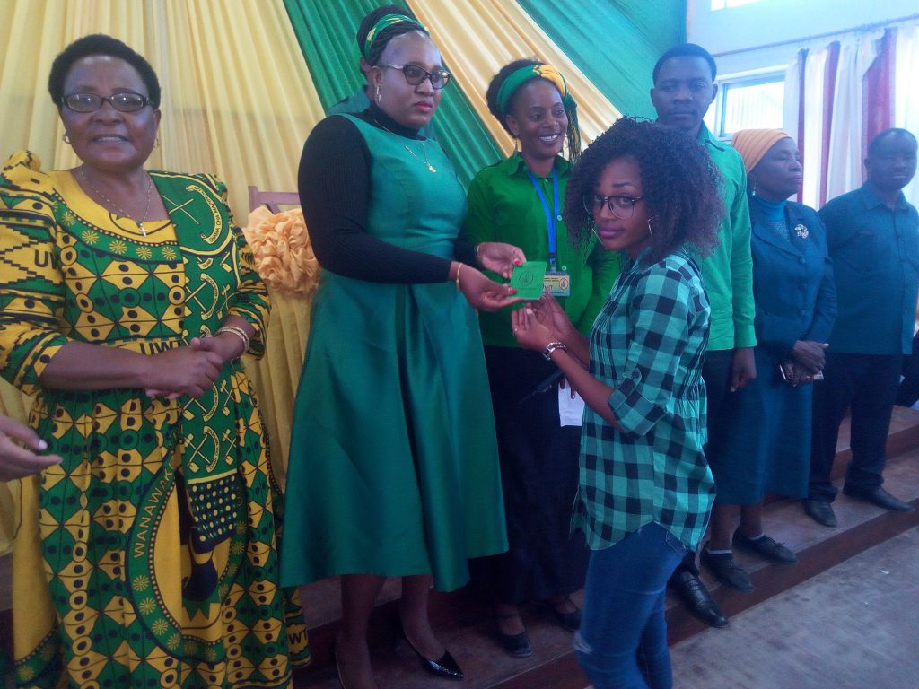 Naibu Katibu Mkuu wa Umoja wa Wanawake Tanzania (UWT), Jeska Mbogo , akikabidhi kadi kwa mmoja wa wanafunzi wa kike wa vyuo vikuu mkoani Iringa kujiunga na UWT.