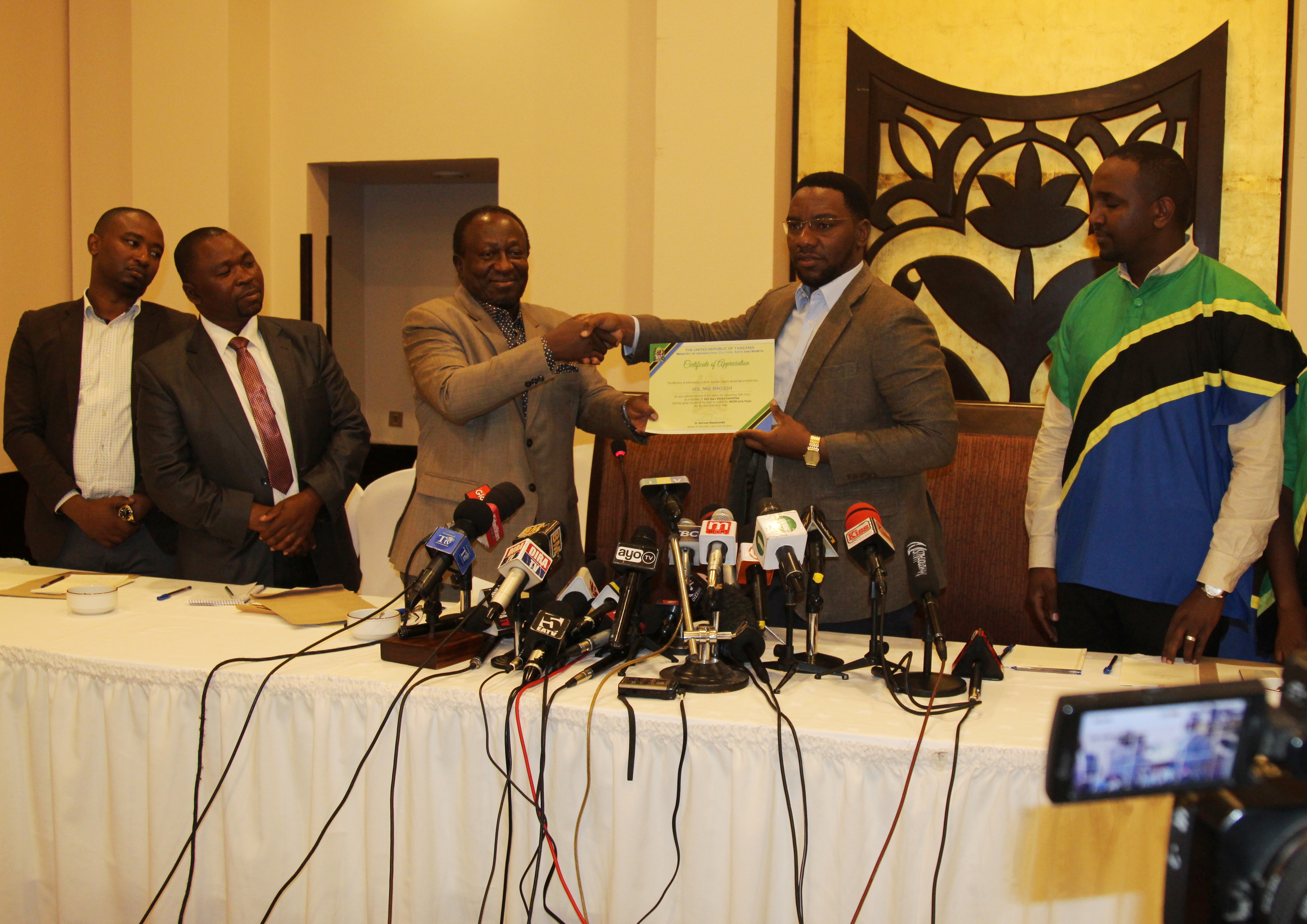 (wa tatu toka kushoto) akimkabidhi cheti Mwenyekiti wa Kamati ya kuisaidia timu ya Taifa “Taifa Stars”, Paul Mokonda kwa kutambua mchango wake katika kufanikisha kufuzu kwa timu hiyo katika mashindano ya Kombe la Mataifa ya Afrika (AFCON) nchini Misri.