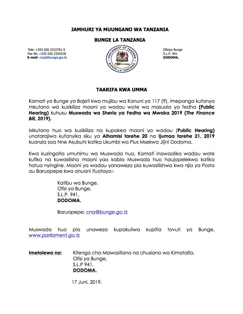 MchanganyikoBUNGE LAWAALIKA WADAU WA MASUALA YA FEDHA KUTOA MAONI KUHUSU MUSWADA WA FEDHA WA MWAKA 2019 Last updated: 2019/06/18 at 7:12 AM Alex Sonna 6 years ago Share SHARE Alex Sonna June 18, 2019 June 18, 2019 Share this Article Facebook Twitter Email Print Previous Article UJENZI WA TAWI LA IFM SIMIYU UTAMALIZIKA SEPTEMBA 2019: PROFESA SATTA Next Article RC MTAKA NA DHANA YA KUSOMA VITABU