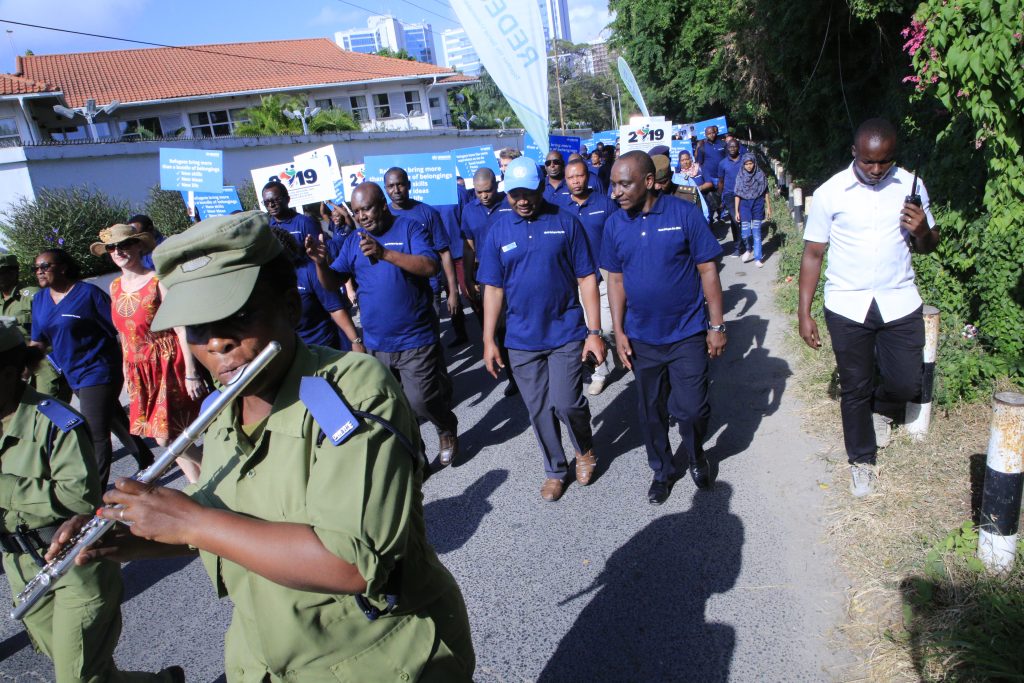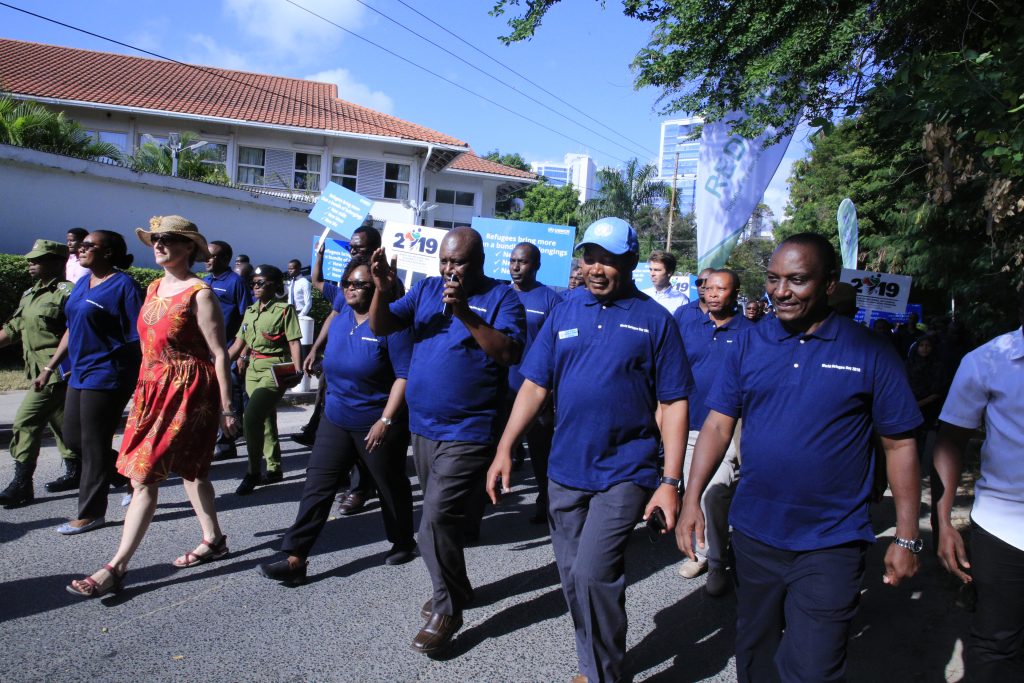 Waziri wa Mambo ya Ndani ya Nchi, Kangi Lugola (watatu kulia) akiongoza maandamano ya kuadhimisha Siku ya Wakimbizi Duniani ambayo imefanyika jijini Dar es Salaam, leo. Wapili kulia ni Katibu Mkuu wa Wizara hiyo, Meja Jenerali Jacob Kingu. Katikati ni Mwakilishi wa Shirika la Kuhudumia Wakimbizi (UNHCR) Nchini, Chansa Kapaya. Na kulia ni Kamishna Jenerali wa Magereza, Phaustine Kasike. Picha na Wizara ya Mambo ya Ndani ya Nchi.