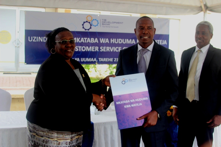 Mkurugenzi Mtendaji wa Benki ya Maendeleo ya TIB, Bw. Charles Singili (katikati) akionesha mfano wa Mkataba wa Huduma kwa Wateja (Customer Service Charter) mara ya kukakidhiwa na Mwenyekiti wa Bodi ya Wakurugenzi wa Benki ya Maendeleo ya TIB, Dkt. Mary Mashingo (kushoto). Anayeshuhudia ni mmoja wa wateja wa benki hiyo, Bw.Joseph Kidaha (kulia).