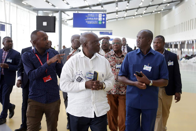 Mwenyekiti wa Bodi ya Mamlaka ya Mawasliano Tanzania (TCRA), Dkt. Jones Killimbe (mwenye shati jeupe), Mkurugenzi Mkuu wa Mamlaka hiyo, Mhandisi James M. Kilaba, (kulia), wajumbe wa Bodi na Kamati ya Maudhui ya TCRA wakiongozwa na Msimamizi wa Mradi wa ujenzi wa jingo la Terminal 3 (TBIII) la kiwanja cha ndege cha Julius Nyerere jijini Dar es Salaam Juni 21, 2019.