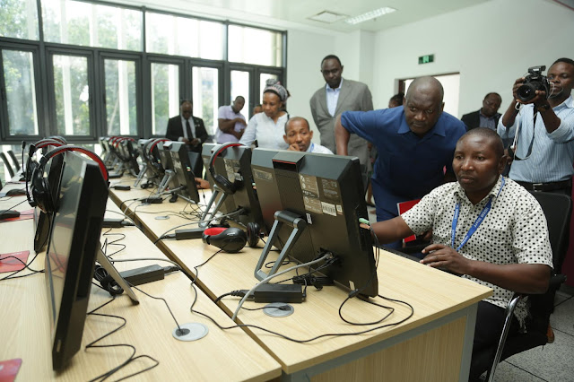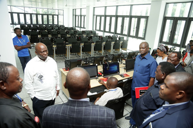 Mwenyekiti wa bodi, Dkt. Jones Killimbe (kushoto) na Mkurugenzi Mkuu wa Mamlaka hiyo, Mhandisi James M. Kilaba (mwenye nguo za kibuluu), pamoja na ujumbe wakiouongoza, wakiwa kwenye chumba cha maktaba ya kielektroniki (e-library) ya Maktaba hiyo ya kisasa ya Chuo Kikuu cha Dar es Salaam.