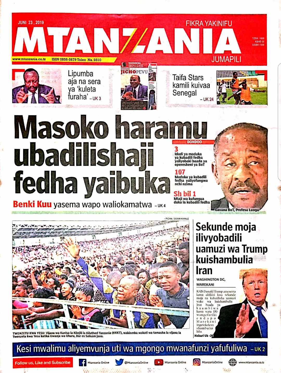 MichezoPITIA VICHWA VYA HABARI KATIKA MAGAZETI YA LEO JUMAPILI JUNI 23,2019 Last updated: 2019/06/23 at 4:40 AM Alex Sonna 6 years ago Share SHARE Alex Sonna June 23, 2019 June 23, 2019 Share this Article Facebook Twitter Email Print Previous Article WATUMISHI OFISI YA WAZIRI MKUU WAASWA KUZINGATIA MAADILI Next Article DKT. MWANJELWA ASHANGAZWA NA HALMASHAURI YA MANISPAA YA MOROGORO KUTOA KIWANJA KWA WAJASIRIAMALI KATIKA ENEO HATARISHI