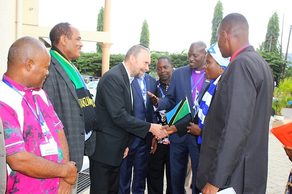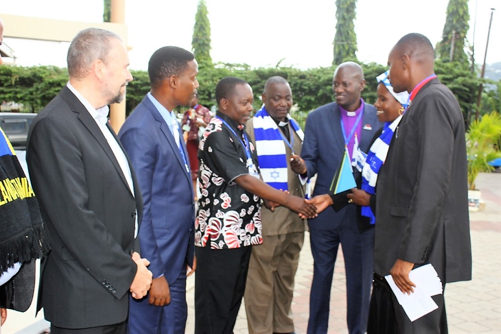 Mgeni rasmi, Mkuu wa Wilaya Nyamagana Dkt. Philis Nyingi (wa pili kulia)akisalimiana na Makamu wa Rais wa ICEJ Israel, Dkt. Mojmir Kallus (wa tatu kushoto).