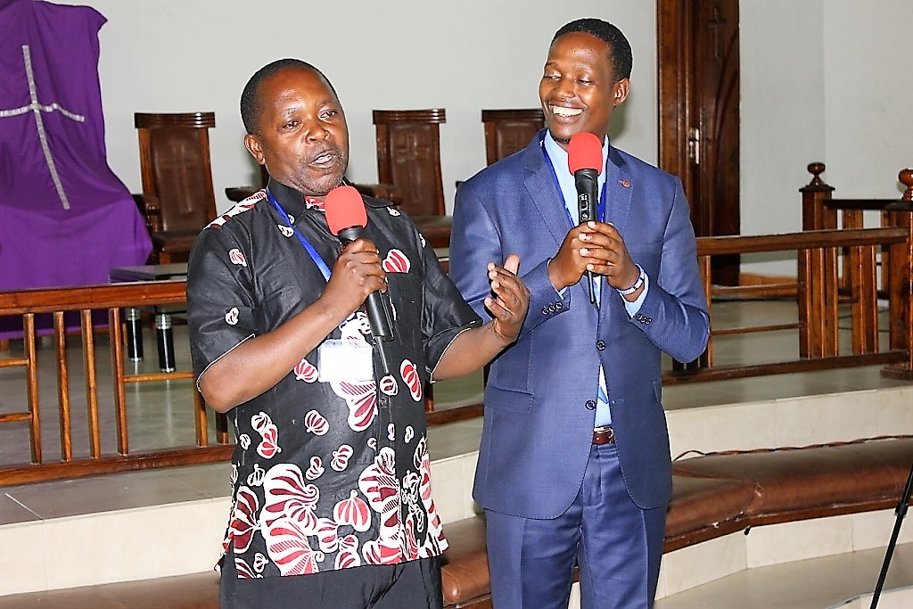 Mkurugenzi wa shirika la ICEJ Tanzania, Stanton Newton Kanyiki (kushoto) akitoa ufafanuzi kuhusiana na Kongamano la Kikristo Afruka Mashariki. Kulia ni mkarimani kwenye kongamano hilo.