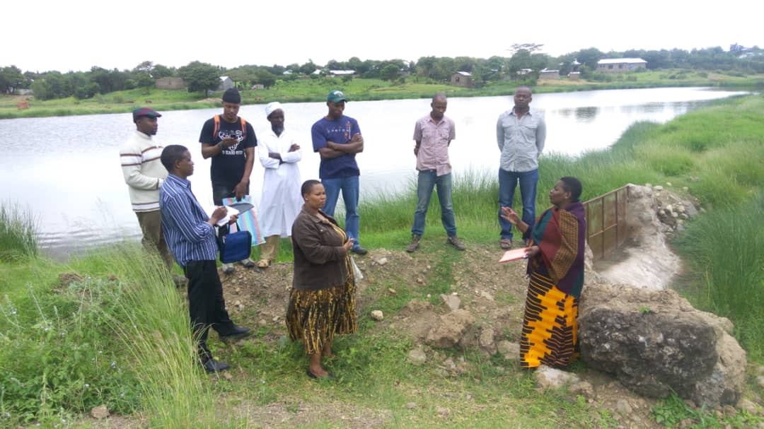 Afisa Maendeleo ya Vijana Ofisi ya Waziri Mkuu – Kazi, Vijana, Ajira na wenye Ulemavu, Bi. Amina Sanga (Mbele Kulia) akizungumza na wanachama wa Kikundi cha MVG kinachojishughulisha na Mradi wa ufugaji samaki katika bwawa walilochimba wenyewe ndani ya Halmashauri ya Wilaya ya Hai Mkoani Kilimanjaro. Kwa Mbele Katikati ni Afisa Maendeleo ya Vijana wa Halmashauri ya Wilaya Hai, Bi. Chima na nyuma yake ni Afisa Maendeleo ya Vijana Ofisi ya Waziri Mkuu – Kazi, Vijana, Ajira na wenye Ulemavu Bw. Godfrey Chacha.