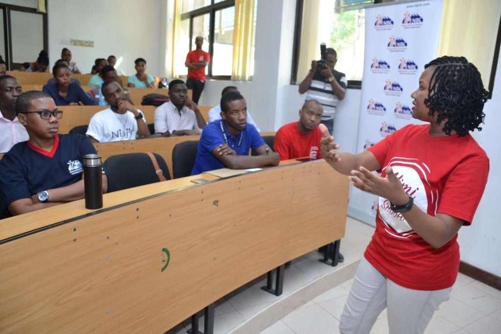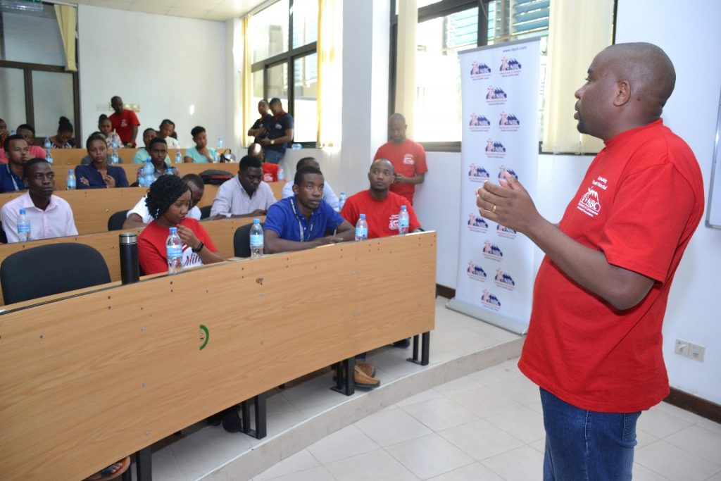 Meneja Mikopo Midogo midogo wa Benki ya NBC, Mtenya Cheya akizungumza na baadhi ya wanafunzi wa Shule ya Biashara ya Chuo Kikuu cha Dar es Salaam (UDBS), wakati wa semina kuhusu ujuzi katika sekta ya benki pamoja na masoko ya fedha na mitaji hapa nchini.Semina hiyo ilifanyika chuoni hapo jijini Dar es Salaam juzi.