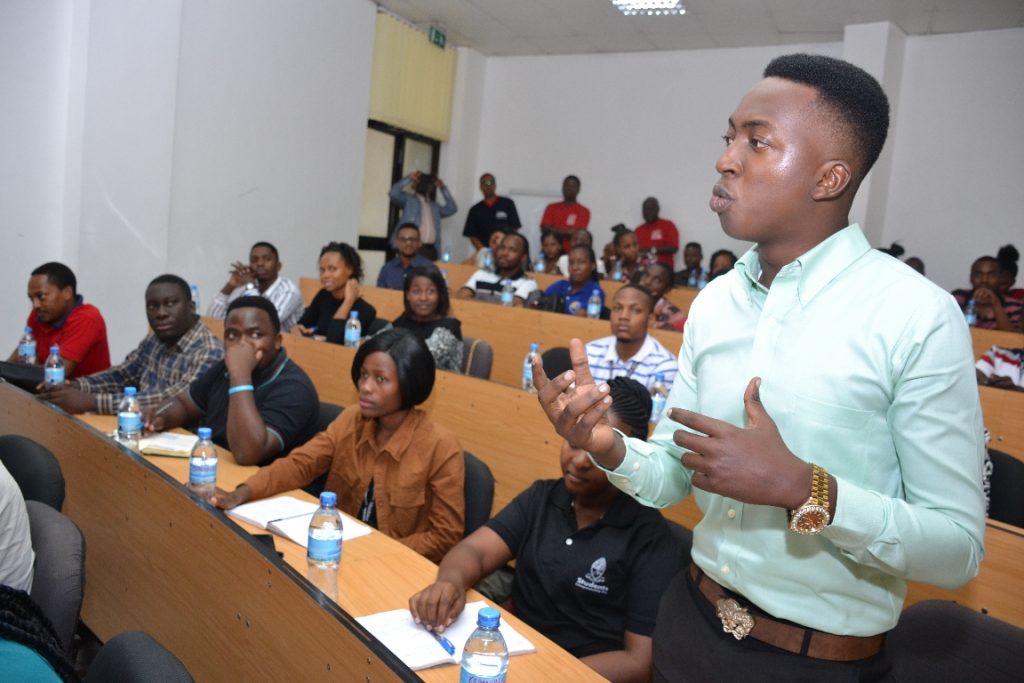 Mmoja wa wanafunzi wa UDBS akiulizwa swali katika semina hiyo iliyoandaliwa na NBC ilikiwa na moja ya majukumu ya shughuli za kijamii za benki hiyo kwa lengo la kuongeza ufahamu wa wanafunzi hao katika masuala yab sekta za kibenki na masoko ya fedha na mitaji.