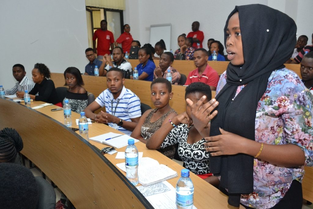 Mmoja wa wanafunzi wa UDBS akiulizwa swali katika semina hiyo iliyoandaliwa na NBC ilikiwa na moja ya majukumu ya shughuli za kijamii za benki hiyo.