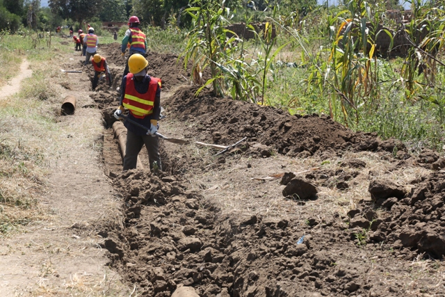 Kazi ya uchimbaji mtaro kwa ajili ya kubadilisha mabomba yaliyochakaa ikiendelea katika mradi wa maji wa Ntomoko.