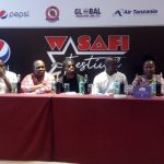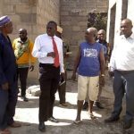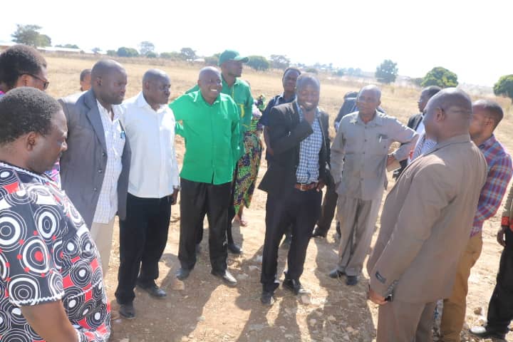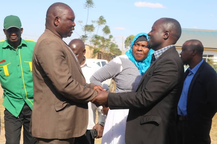 Meya wa mji wa Tunduma Mhe. Ally Mwafongo akisalimiana na mwenyekiti wa Halmashauri ya wilaya ya Mbozi Elick Ambakisye( Mwenye koti jeusi) kwenye eneo la mradi