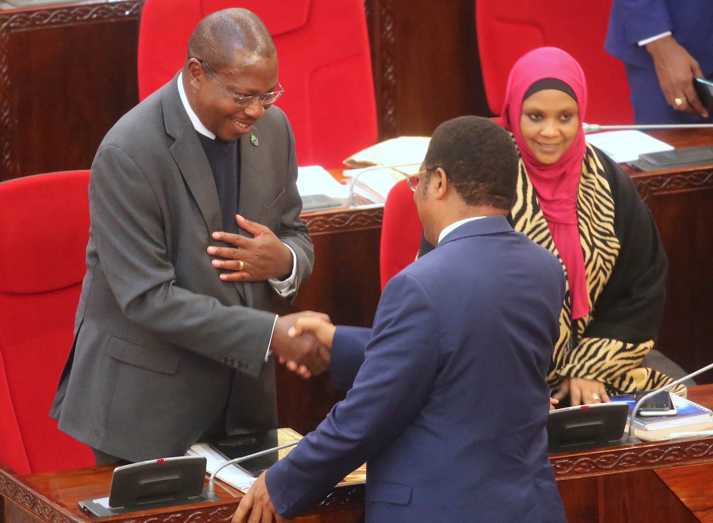 Waziri Mkuu, Kassim Majaliwa akimpongeza Waziri wa Fedha na Mipango, Dkt. Philip Mpango na Naibu wake, Dkt. Ashatu Kijaji (kulia) baada ya Waziri wa Fedha na Naibu wake kujibu hoja za wabunge kuhusu Bajeti ya Serikali, Bungeni jijini Dodoma, Juni 25, 2019. (Picha na Ofisi ya Waziri Mkuu)