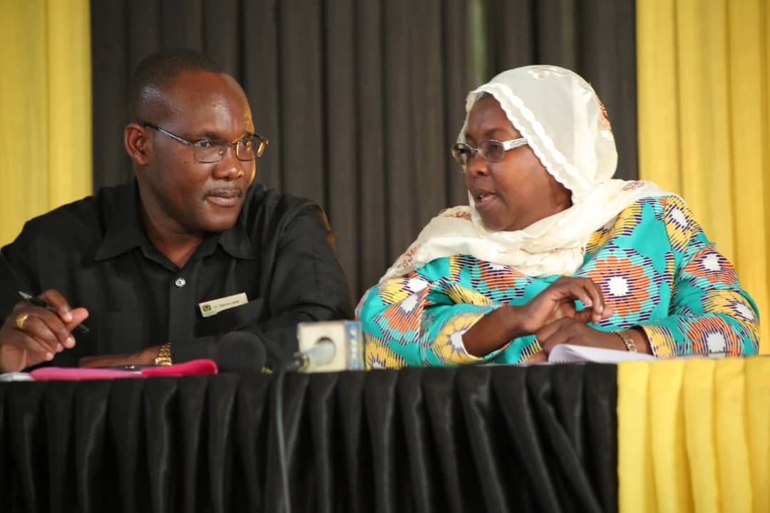 Katibu Mkuu Wizara ya Afya Dkt. Zainab Chaula akiteta jambo na Mkurugenzi wa Mafunzo Wizara ya Afya Dkt Laizer wakati wa ufunguzi wa mkutano wa Wakuu wa Vyuo vya Afya vya Serikali, uliofanyika jijini Dodoma.