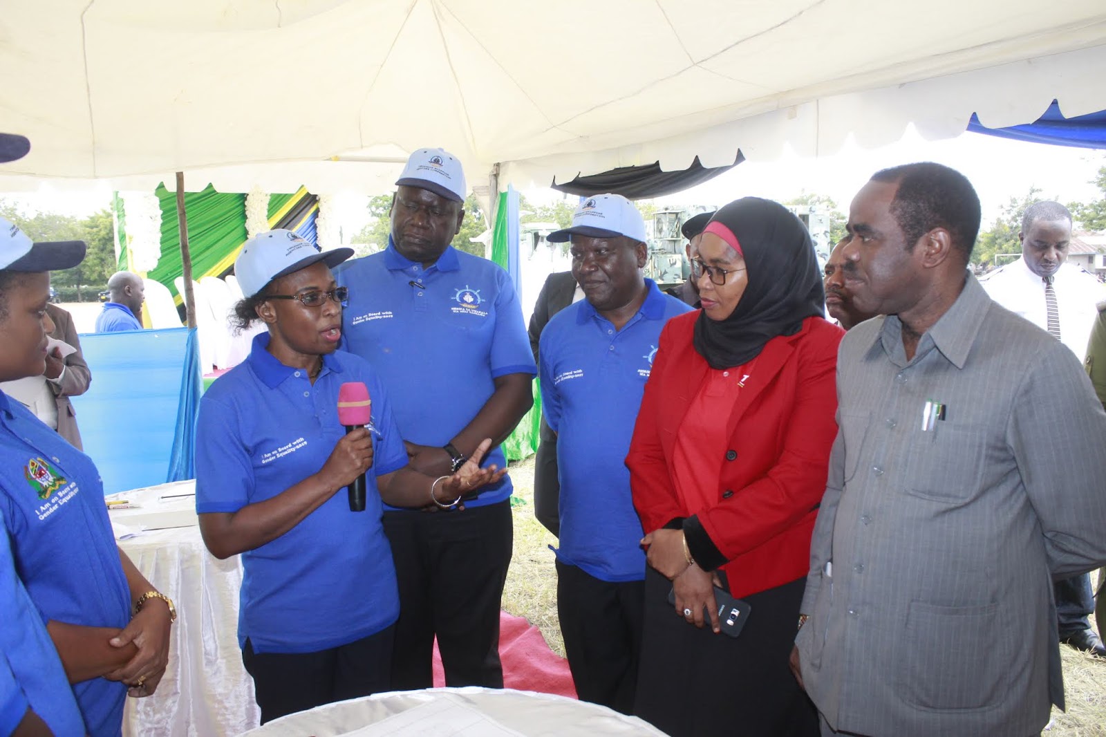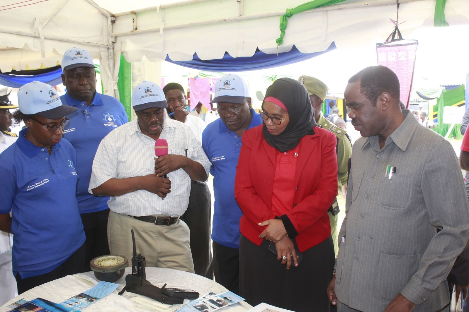 MENEJA Usajili ,Ukaguzi na Udhibiti wa Usalama wa Meli (TASAC) Mhandisi Alfred Waryana Misana kushoto akimueleza jambo Mkuu wa Mkoa wa Tanga Martine Shigella kulia wakati alipotembelea mabanda kulia ni Katibu Tawala wa Mkoa wa Tanga Mhandisi Zena Saidi