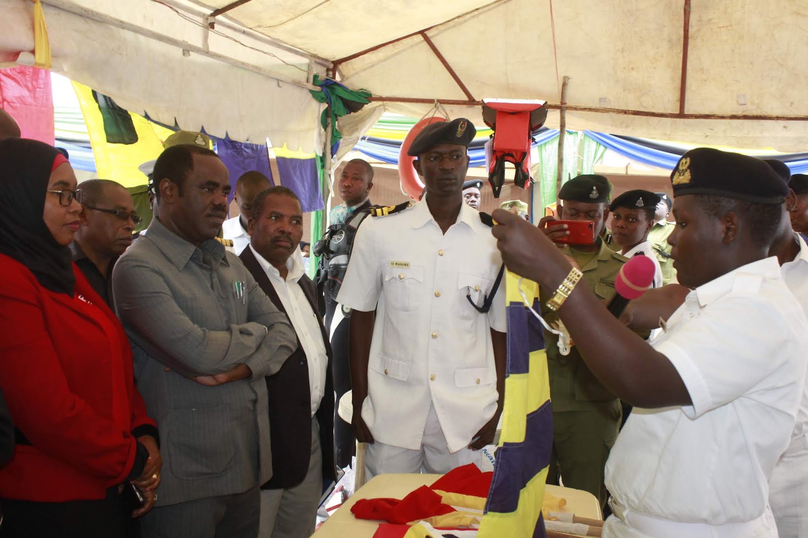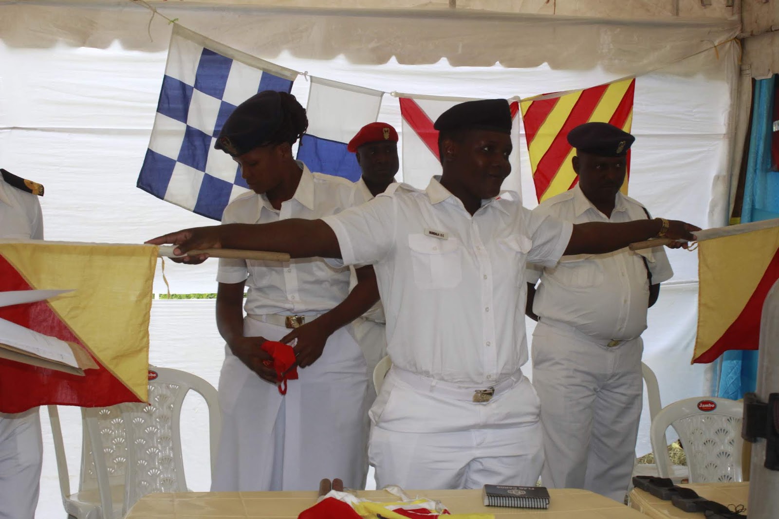 AFISA Mawasiliano wa Jeshi la Baharini (Nevy) mwenye cheo cha kawaida Ester Bundala akionyesha bendera za mawasiliano wanazotumia