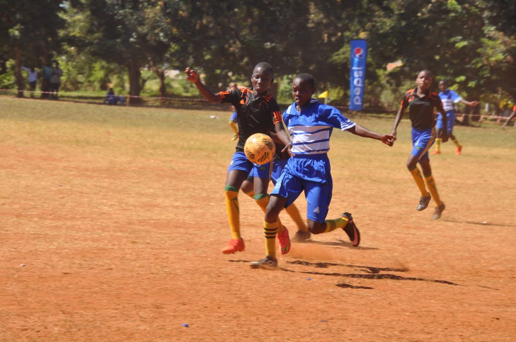 Lidya Daudi wa timu ya soka ya wasichana Geita (mwenye jezi ya bluu) akichuana vikali kugombea mpira na mchezaji Eneck Daud wa Mbeya (jezi nyeusi) wakati timu hizo zilipocheza hivi karibuni.