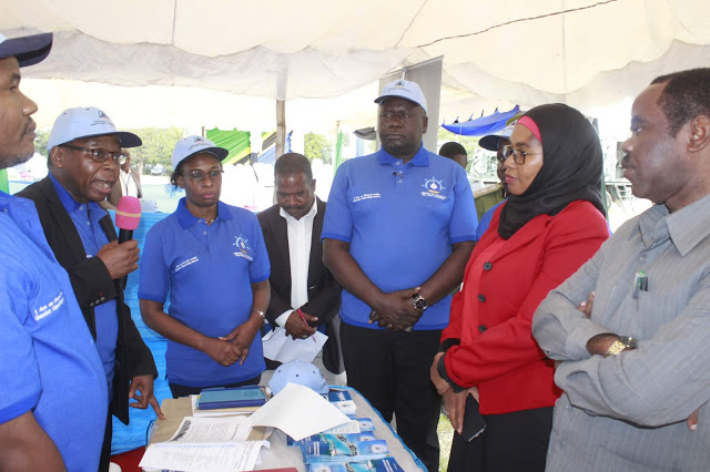 Meneja wa Usajili,Ukaguzi na Udhibiti wa Usalama wa Vyombo vya maji Shirika la Wakala wa Meli Tanzania (TASAC) Afred Waryana wa pili kushoto akimueleza jambo Mkuu wa Mkoa wa Tanga Martine Shigella alipotembelea banda lao wakati wa maadhimisho ya wiki ya mabaharia kwenye viwanja vya Tangamano Jijini Tanga kulia ni Katibu Tawala wa Mkoa wa Tanga Mhandisi Zena Saidi
