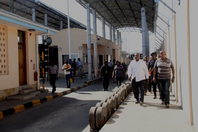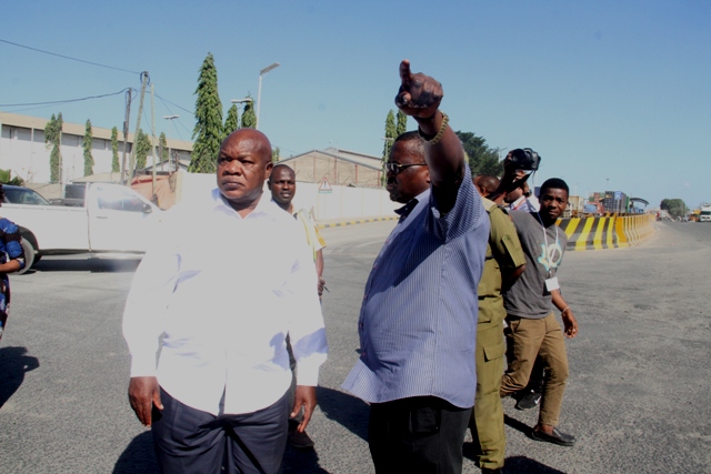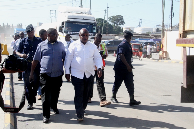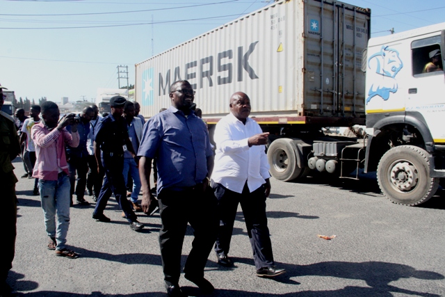 WAZIRI wa Ujenzi, Uchukuzi na Mawasiliano, Isack Kamwele akiongozana na Mkurugenzi wa Mamlaka ya Bandari Tanzania TPA Injinia Deusdedit Kakoko wakati alipotembelea kukagua mizani ya Shimo la Udongo ambako kulilipotiwa mgomo wa madereva wa malori kuanzia jana mchana mpaka usiku.