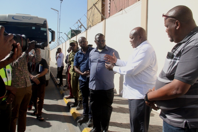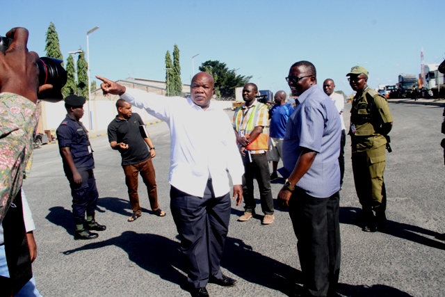 WAZIRI wa Ujenzi, Uchukuzi na Mawasiliano, Isack Kamwele maelekezo kwa Mkurugenzi wa Mamlaka ya Bandari Tanzania TPA Injinia Deusdedit Kakoko wakati alipotembelea kukagua mizani ya Shimo la Udongo ambako kulilipotiwa mgomo wa madereva wa malori kuanzia jana mchana mpaka usiku.