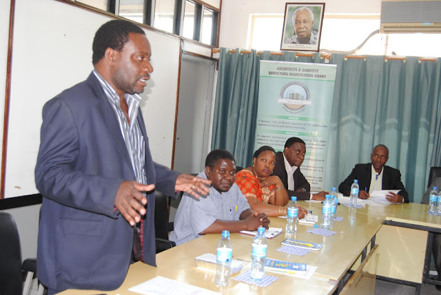 Kaimu Msajili wa Bodi ya Usajili wa Wabunifu Majengo na Wakadiriaji Majenzi (AQRB) Arch.Albert Munuo, akisoma taarifa kuhusu majukumu ya bodi hiyo (kulia) Mwenyekiti wa Bodi hiyo Dkt. Ludigija Bulamile.