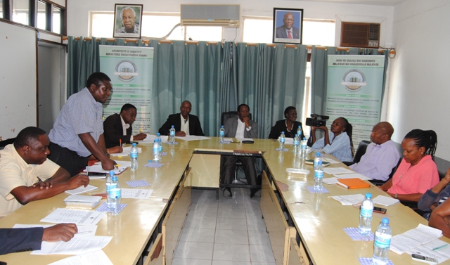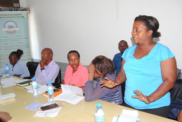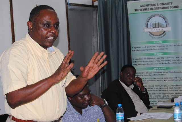 Waandishi wa Habari wakichangia mada mbali mbali wakati wa mafunzo ya kuwajengea uwezo yaliyoandaliwa na Bodi ya Usajili wa Wabunifu Majengo na Wakadiriaji Majenzi (AQRB) kuacha kuichanganya taaluma yao na ile ya wahandisi badala yake iuelimishe umma tofauti iliyopo baina ya taaluma hizo mbili na umuhimu wa kuwatumia wataalamu hao wanapofanya ujenzi.