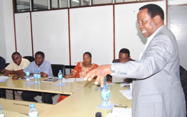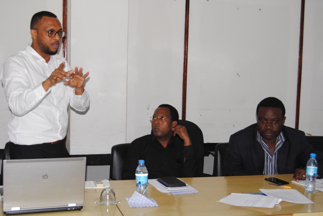 Afisa Mdhibiti Mwandamizi wa Bodi ya Usajili wa Wabunifu Majengo na Wakadiriaji Majenzi (AQRB) Mlezi Makuka (kushoto aliyesimama) akichangia mada yake wakati wa mafunzo ya kuwajengea uwezo waandishishi wa habari yaliyoandaliwa na bodi hiyo kuhusu kuacha kuichanganya taaluma yao na ile ya wahandisi badala yake iuelimishe umma tofauti iliyopo baina ya taaluma hizo mbili na umuhimu wa kuwatumia wataalamu hao wanapofanya ujenzi.