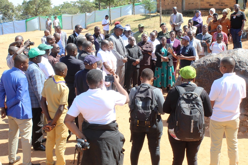 Naibu Waziri wa Maliasili na Utalii, Mhe. Constantine Kanyasu (katikati) akiwa na Wakuu wa mikoa ya Nyanda za Juu Kusini wakipewa maelezo na Mkuu wa kituo cha Kimondo cha Mbozi, Paul Nyelo wakati walipotembelea katika eneo hilo wakati wa kufunga maadhimisho ya Siku ya Kimondo Duniani ambapo kitaifa maadhimisho hayo yamefanyika katika kijiji cha Ndolezi mkoani Songwe.