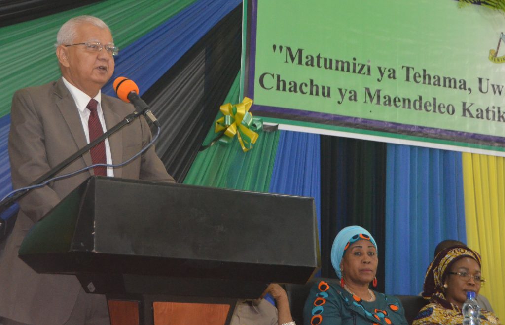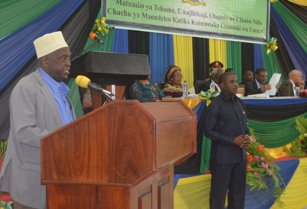 Waziri wa Nchi Ofisi ya Rais Utumishi wa Umma na Utawala Bora Haroun Ali Suleiman akitoa hotuba ya makaribisho kwa Mgeni rasmi katika Maadhimisho ya Wiki ya Utumishi wa Umma yaliofanyika katika ukumbi wa Sheikh Idriss Abdul-wakil kikwajuni Zanzibar.