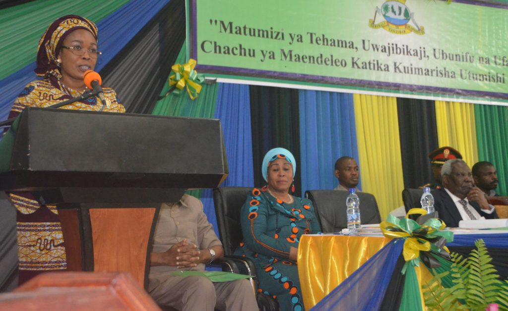 Naibu Waziri Ofisi ya Rais Menejimenti ya Utumishi wa Umma na Utawala Bora Dk,Mary Mwanjelwa akizungumza katika Maadhimisho ya Wiki ya Utumishi wa Umma yaliofanyika katika ukumbi wa Sheikh Idriss Abdul-wakil kikwajuni Zanzibar.
