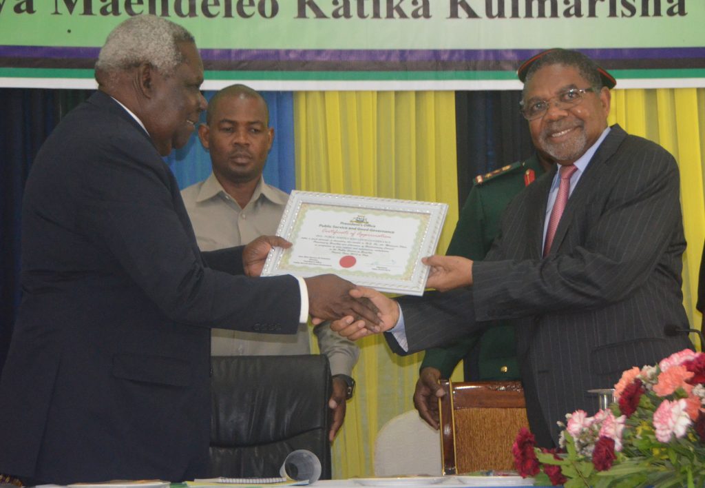 Rais wa Zanzibar na Mwenyekiti wa Baraza la Mapinduzi Dk Ali Mohamed Shein akimkabidhi Katibu Mkuu Baraza la Mapinduzi na Katibu Mkuu kiongozi Abdulhamid Yahya Mzee Cheti maalum katika Maadhimisho ya Wiki ya Utumishi wa Umma yaliofanyika katika ukumbi wa Sheikh Idriss Abdul-wakil kikwajuni Zanzibar.