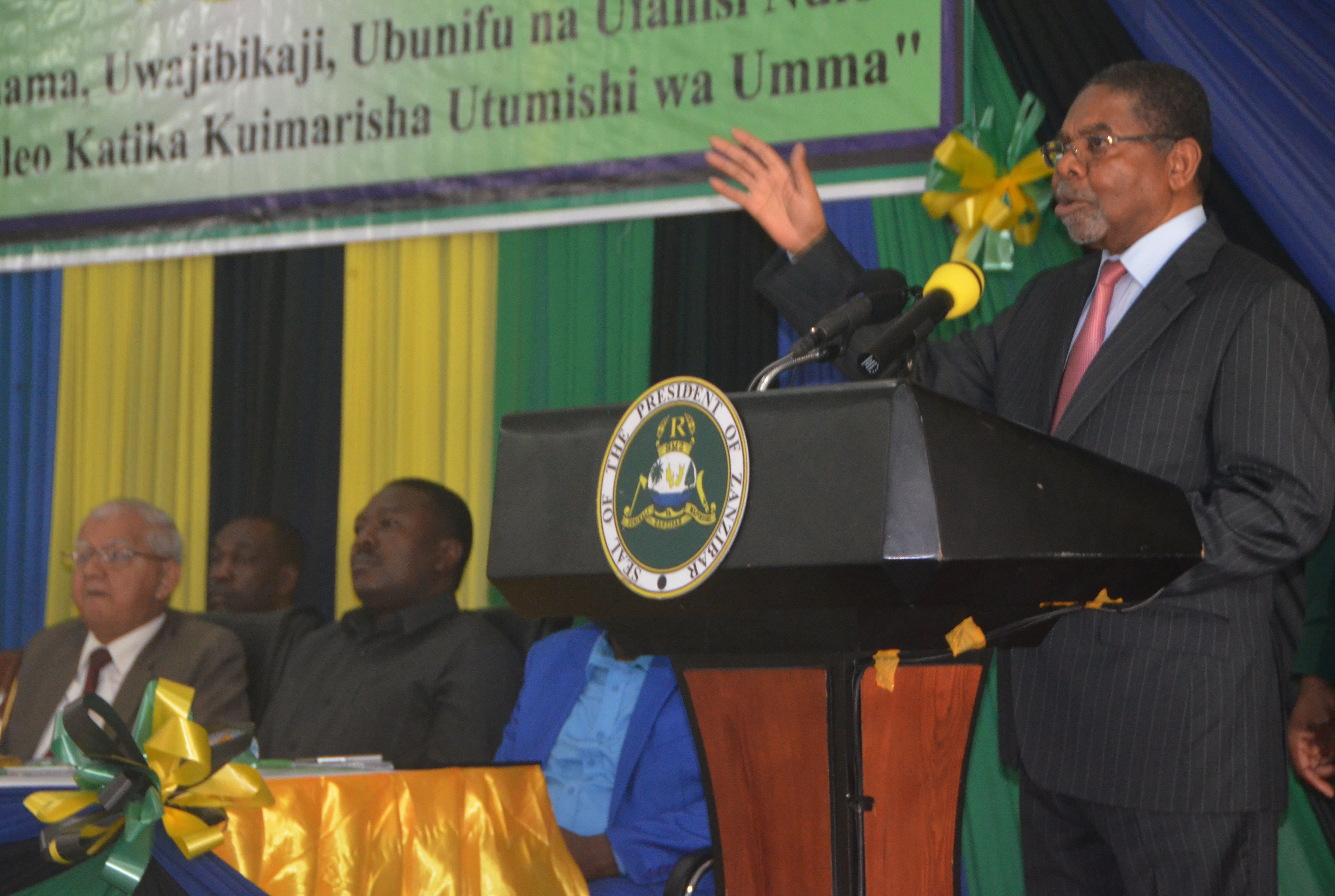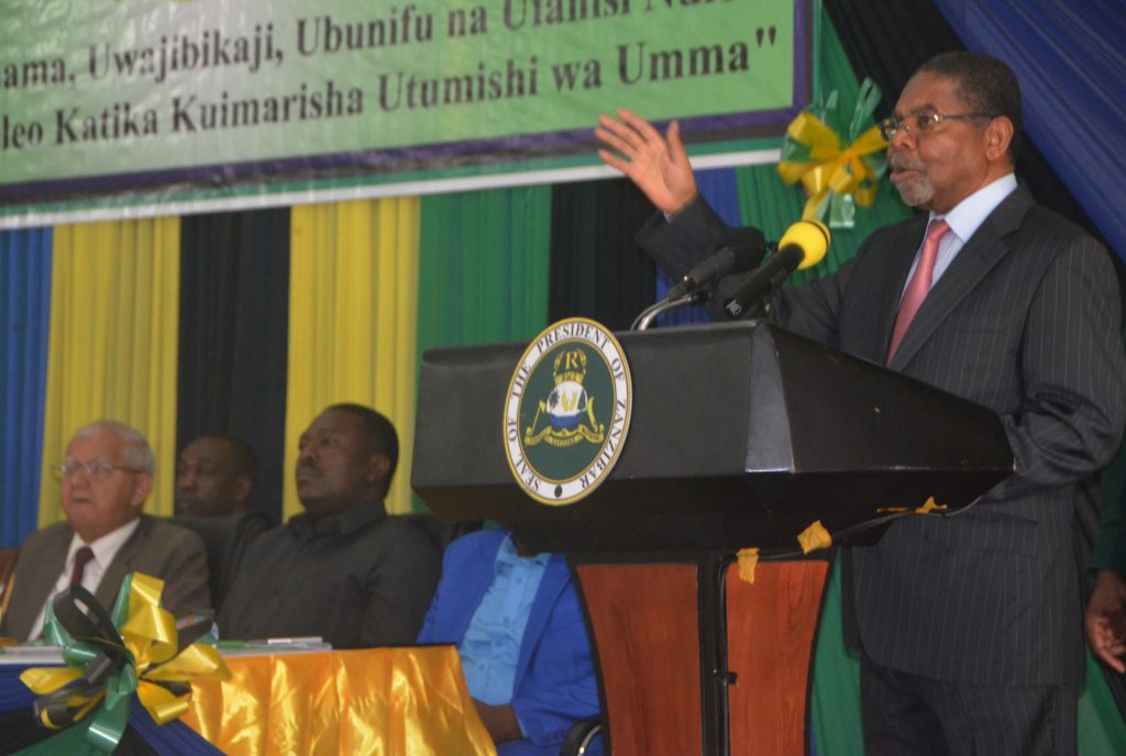 Rais wa Zanzibar na Mwenyekiti wa Baraza la Mapinduzi Dk Ali Mohamed Shein akitoa hotuba ya ufunguzi wa Maadhimisho ya Wiki ya Utumishi wa Umma yaliofanyika katika ukumbi wa Sheikh Idriss Abdul-wakil kikwajuni Zanzibar.