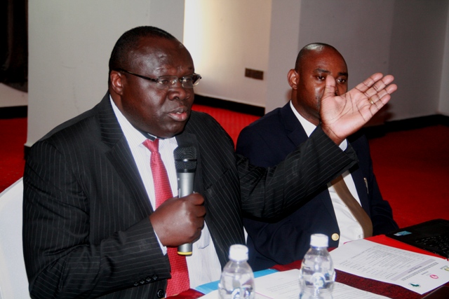 Naibu Katibu Mkuu wa Jumuiya ya Afrika Mashariki Dk. Christopher Bazivamo akifugua semina ya waandishi wa habari iliyofanyika mwanzoni mwa wiki hii kwenye hoteli ya Golden Tulip Posta jijini Dar es salaam kuhusu mradi wa (50 Milioni African Women Speak Networking) unaotekelezwa katika nchi za jumuiya za (EAC), (ECOWAS) na (COMMESA) , Kulia ni JUvenari Ndimurirwo Mkurugenzi wa Fedha (EAC)