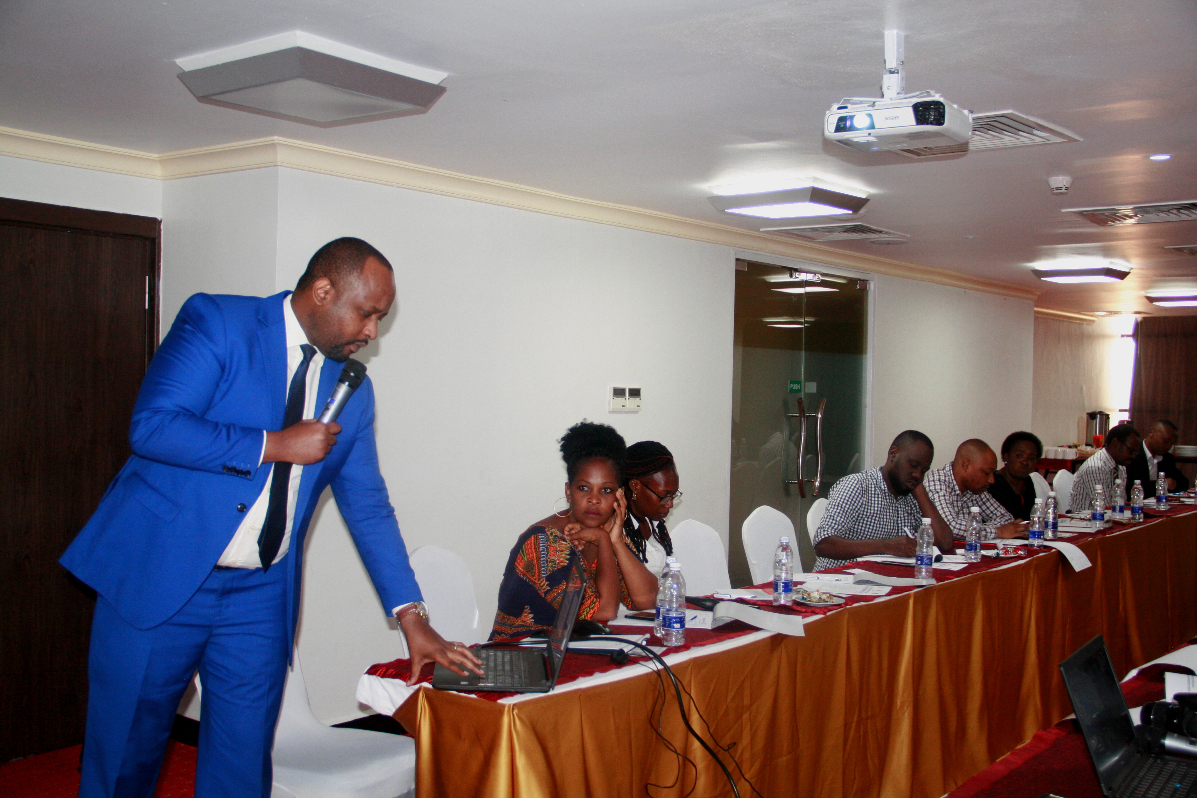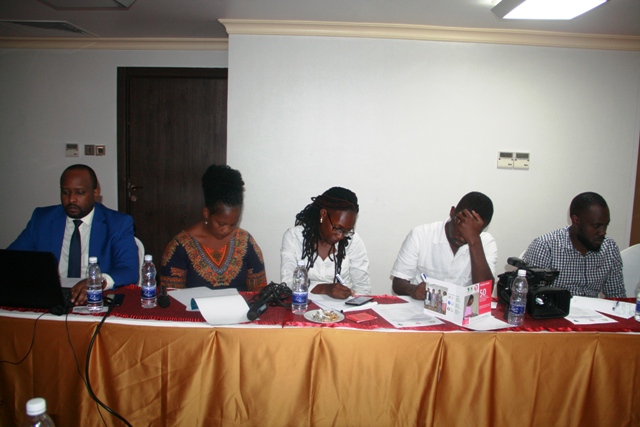 Bw. Wilson Muyenzi Mratibu wa Mradi wa 50 Milioni African Women Speak Networking akiwasilisha mada kwa waandishi wa habari katika semina hiyo.
