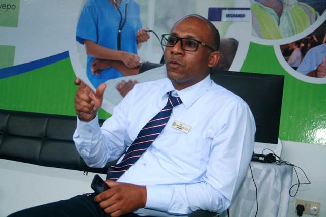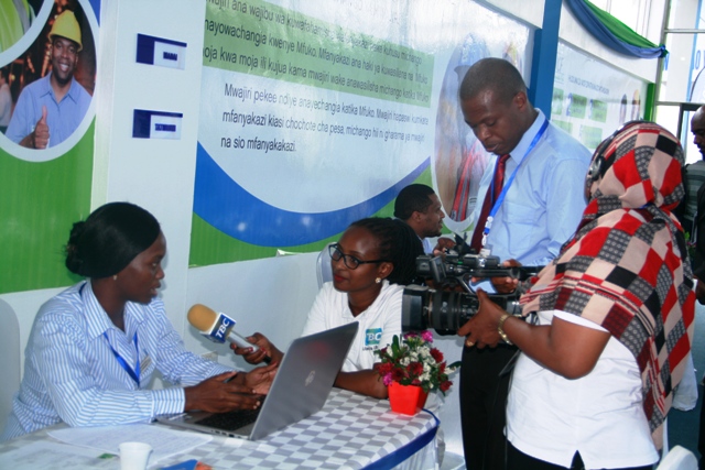 Mkurugenzi wa Huduma za Tiba na Tathmini Mfuko wa Fidia Kwa Wafanyakazi, (WCF), Dkt. Abdulsalaam Omary akielezea mambo mbalimbali wakati alipozungumza na waandishi wa habari katika mahojiano yaliyofanyika kwenye banda la maonesho la WCF viwanja vya JK Nyerere Barabara ya Kirwa jijini Dar es salaam jana.