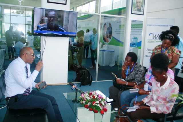 Afisa Uhusiano Mwandamizi wa Mfuko wa Fidia Kwa Wafanyakazi, (WCF), Bw. Sebera Fulgence akimkaribisha Mkurugenzi wa Huduma za Tiba na Tathmini Mfuko wa Fidia Kwa Wafanyakazi, (WCF), Dkt. Abdulsalaam Omary ili kuzungumza na waandishi wa habari katika banda hilo jana.