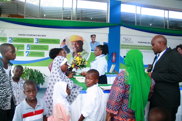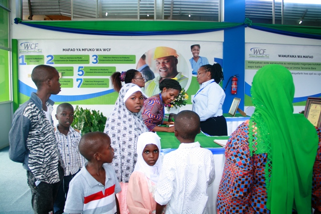 Afisa Uhusiano Mwandamizi wa Mfuko wa Fidia Kwa Wafanyakazi, (WCF), Bw. Sebera Fulgenceakitoa maelezo kwa wageni mbalimbali waliotembelea banda hilo.
