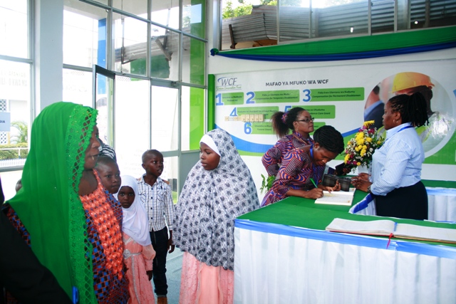 Baadhi ya wananchi wakipata maelezo katika banda la Mfuko wa Fidia Kwa Wafanyakazi, (WCF) kwenye maonesho ya biashara ya Sabasaba barabara ya Kirwa jijini Dar es salaam.
