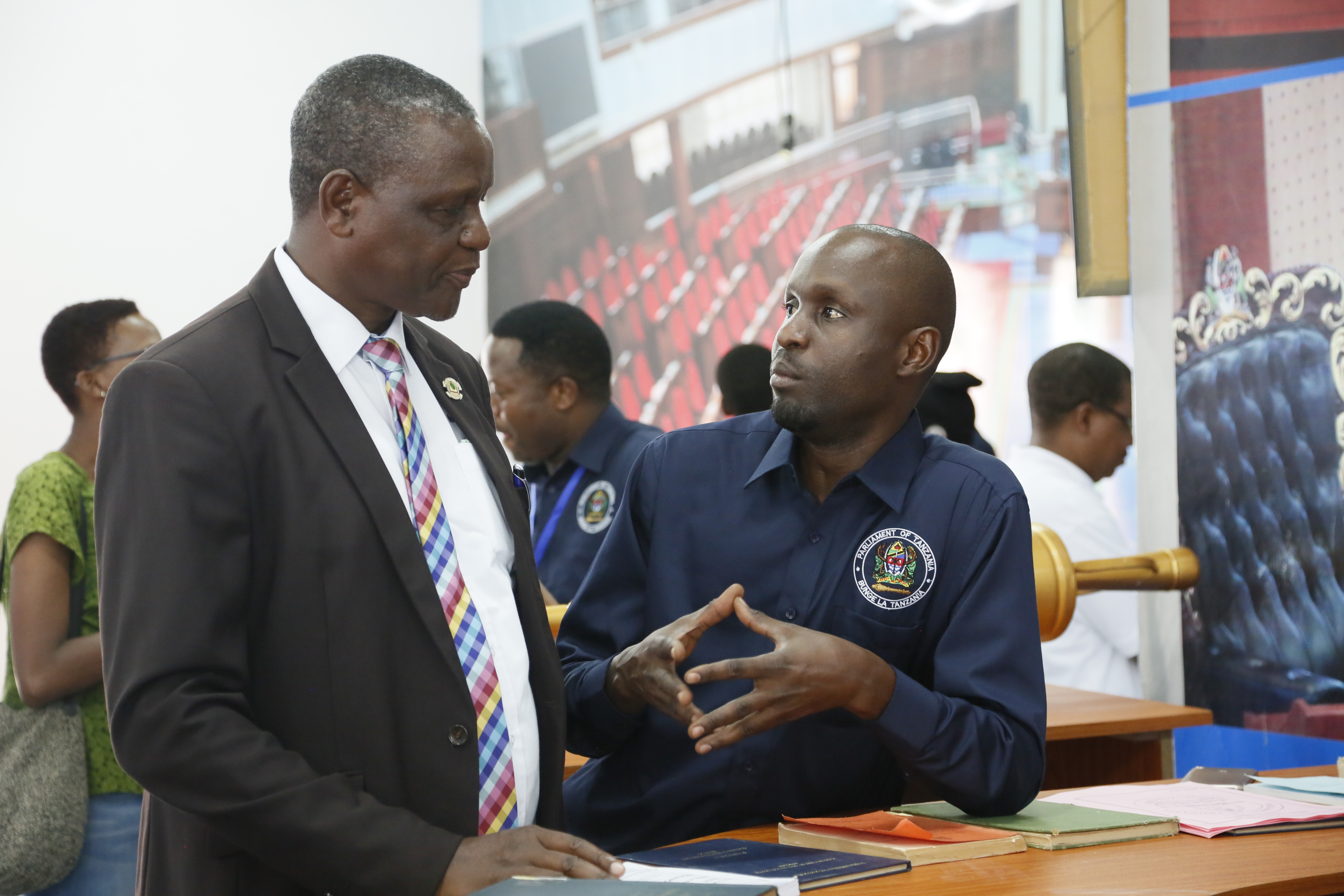 Afisa wa Bunge Ndg. Omary Machunda (Kulia) akimpa Elimu kuhusu Shughuli zinazofanywa na Mhimili wa Bunge Askofu Mkuu wa Kanisa la Waadventista Wasabato Tanzania Askofu Mark Malekana alipotembelea banda la Bunge katika Maonyesho ya 43 ya Sabasaba Jijini Dar es Salaam hii leo. ( Picha na Ofisi ya Bunge)