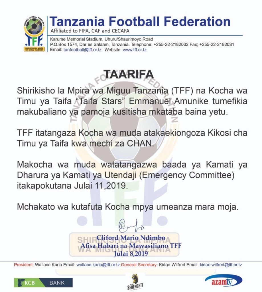 MichezoNDOA YA KOCHA AMUNIKE NA TFF RASMI YAVUNJIKA Last updated: 2019/07/08 at 1:35 PM Alex Sonna 6 years ago Share SHARE Alex Sonna July 8, 2019 July 8, 2019 Share this Article Facebook Twitter Email Print Previous Article Next Article AGIZO LA WAZIRI JAFO LATEKELEZWA KWA VITENDO WILAYANI PANGANI