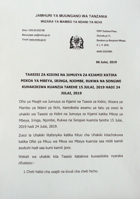 MchanganyikoTAASISI ZA KIDINI NA JUMUIYA ZA JAMII KATIKA MIKOA YA MBEYA,IRINGA,NJOMBE,RUKWA NA SONGWE KUHAKIKIWA KUANZIA TAREHE 15 JULAI,2019 HADI 24 JULAI,2019 Last updated: 2019/07/09 at 12:32 PM Alex Sonna 7 years ago Share SHARE Alex Sonna July 9, 2019 July 9, 2019 Share this Article Facebook Twitter Email Print Previous Article MAKAMU WA RAIS AHUDHURIA HAFLA YA CHAKULA CHA JIONI KILICHOANDALIWA NA RAIS WA NIGER Next Article Tanzania Kuendelea Kunufaika Kiuchumi na SADC