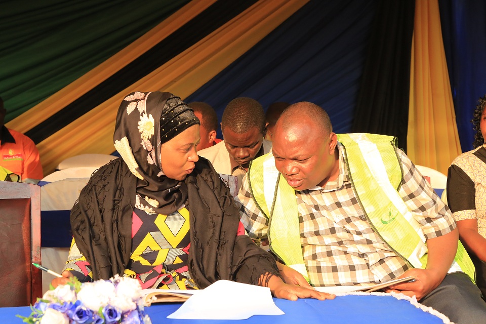 Naibu Waziri wa Nishati, Subira Mgalu( mwenye kilemba cheusi) akiteta jambo na Mkuu wa Wilaya ya Kibondo, Lois Peter Bura (mwenye Kaunda suti) mara baada ya kuwasha umeme katika kijiji cha Nyange na kukagua maendeleo ya utekelezaji wa mradi wa usambazaji umeme vijijini( REA) katika wilaya hiyo.
