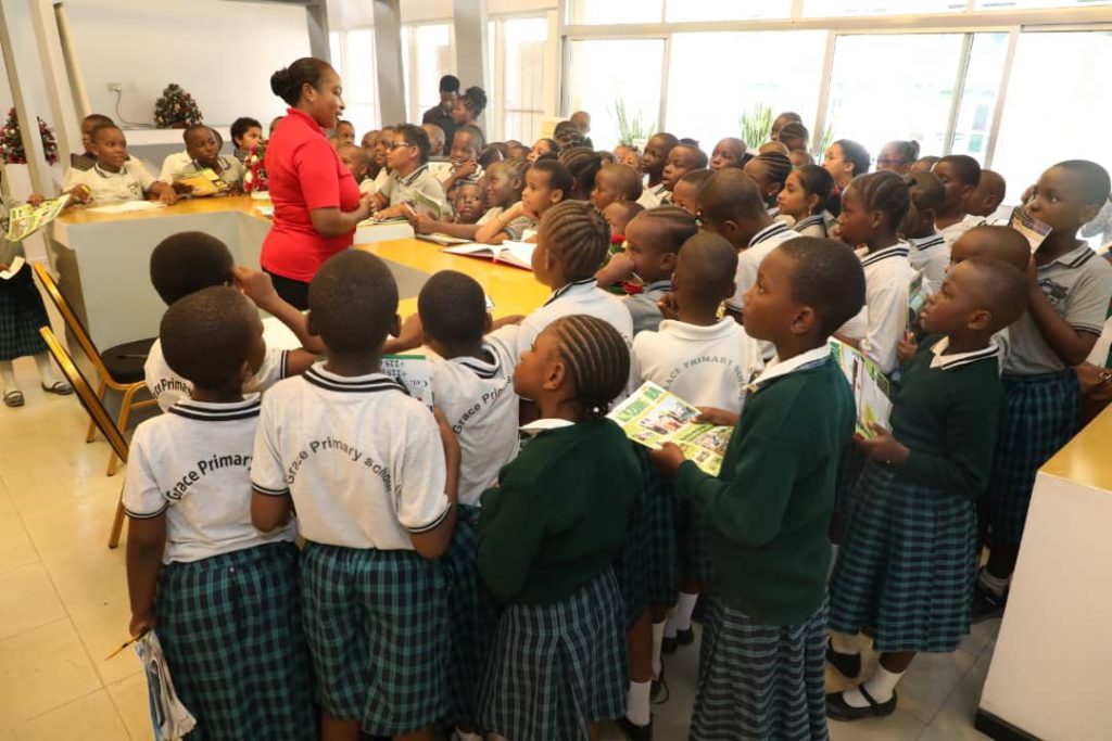 Meneja Msaidizi Idara ya Sarafu, Bw. Abdul Dollah akiwafundisha wanafunzi kutoka shule ya Grace Nursery and Primary School