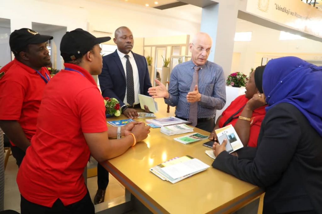 Mkaguzi wa Mabenki, Bw. Gwamaka Charles kutoka Kurugenzi ya Usimamizi wa Sekta ya Fedha akitoa elimu kwa wanafunzi wa shule ya Sekondari Canossa waliotembelea banda la BoT Sabasaba.