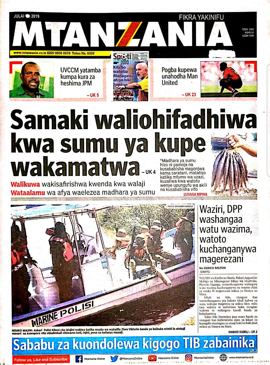 MagazetiPITIA VICHWA VYA HABARI KATIKA MAGAZETI YA LEO JUMATATU JULAI 15,2019 Last updated: 2019/07/15 at 3:35 AM Alex Sonna 6 years ago Share SHARE Alex Sonna July 15, 2019 July 15, 2019 Share this Article Facebook Twitter Email Print Previous Article KATIBU MKUU WA TAGCO AWAPONGEZA MAAFISA MAWASILIANO WA SERIKALI Next Article BARCELONA YAMTAMBULISHA ANTOINE GRIEZMANN BAADA YA KUSAINI MIAKA MITANO